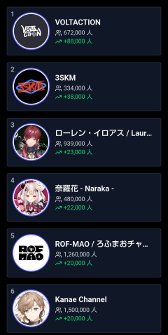引用元: 45: Vtuberまとめ2025/11/02(日) 18:44:54.79 2025年10月 Vtuber登録者増加数ランキング 1位 +90,000 小廻こま (ミリプロ) 2位 +84,400 コンプサウルス (ゆにれいど/brave group) 3位 +39,000 メーメントヴァニタス (無原唱レコード/brave group) 4位 +33,200 光葉エニ (ネオポルテ/brave group) 5位 +30,000 轟はじめ (ホロライブDEV_IS) 6位 +26,000 眠雲ツクリ (ミリプロ) 6位 +26,000 夜乃くろむ (ぶいすぽ/brave group) 8位 +25,000 音ノ乃のの (ミリプロ) 9位 +24,300 群青ロマン (ゆにれいど/brave group) 10位 +24,000 本阿弥あずさ (すぺしゃりて) 11位 +23,600 おなつのにびたし (個人) 12位 +23,000 水宮枢 (ホロライブDEV_IS) 12位 +23,000 甘狼このみ (ミリプロ) 14位 +22,100 雨夜リズ (ミリプロ) 15位 +22,000 音ノ瀬らこ (ミリプロ) 15位 +22,000 奈羅花 (にじさんじ) 17位 +21,400 望月ほぐの (ゆにれいど/brave group) 18位 +21,000 ローレン・イロアス (にじさんじ) 19位 +20,000 猫羽かりん (けもりふ) 19位 +20,000 Sameko Saba (個人) 19位 +20,000 儒烏風亭らでん (ホロライブDEV_IS) 19位 +20,000 フワモコ (ホロライブEN) 19位 +20,000 蝶屋はなび (ぶいすぽ/brave group) 19位 +20,000 叶 (にじさんじ) 19位 +20,000 葛葉 (にじさんじ) 190: Vtuberまとめ2025/11/02(日) 18:49:00.93 >>45 ホロメン全然伸びてないじゃん・・・ 279: Vtuberまとめ2025/11/02(日) 18:51:39.91 >>45 ここには載ってないがにじはなぜかユニットチャンネルが爆伸びしてる 295: Vtuberまとめ2025/11/02(日) 18:51:58.20 >>45 2024年10月 Vtuber登録者増加数ランキング 1位 +892,000 結城さくな (個人)※デビュー 2位 +100,000 宝鐘マリン (ホロライブ) 3位 + 85,000 儒烏風亭らでん (ホロライブDEV_IS) 4位 + 79,000 轟はじめ (ホロライブDEV_IS) 5位 + 52,000 フワモコ (ホロライブEN) 6位 + 43,600 本阿弥あずさ (すぺしゃりて) 7位 + 40,000 さくらみこ (ホロライブ) 7位 + 40,000 星街すいせい (ホロライブ) 9位 + 33,000 音乃瀬奏 (ホロライブDEV_IS) 10位 + 31,000 ルンルン (にじさんじ) ちな去年 350: Vtuberまとめ2025/11/02(日) 18:53:17.97 >>279 なんかにじはユニットチャンネルの広告打ちまくってるらしい 716: Vtuberまとめ2025/11/02(日) 19:01:40.56 >>45 ミリプロ最近伸びすぎだけどなんか大きい事務所なの? 761: Vtuberまとめ2025/11/02(日) 19:02:33.69 >>716 女児人気が高い箱 女児人気だけならにじホロクラス 851: Vtuberまとめ2025/11/02(日) 19:03:55.56 >>761 なんだよそれwww何したらそうなるんだよw 977: Vtuberまとめ2025/11/02(日) 19:07:11.93 >>761 女児ってちゃおのイメージだけで言ってないか? 俺の印象だと中高生くらいだわ 大当たりしたののちゃんのキャチコピー 90日後デビューする16歳vsingerでイメージ決まったと思う…