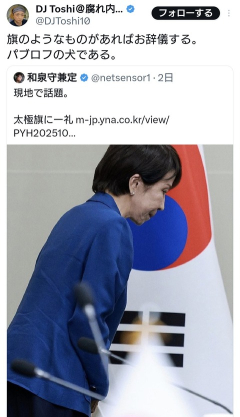 1: 名無しさん@ 2025/11/02(日) 20:11:39.46 ID:iqe/xXgy0● BE:662593167-2BP(2000) 旗のようなものがあればお辞儀する。パブロフの犬である。 — DJ Toshi@腐れ内閣撲滅活動中 (@DJToshi10) October 31, 2025 日韓首脳会談 高市外交高市早苗首相 は握手を交わした後に日本の国旗と、韓国の国旗に一礼し着席。日本国旗を大切にし日本を愛すれば、他国に敬意を払う事も出来る。国旗損壊罪 の制定に反対する勢力には無い心だろう。 pic.twitter.com/ubSBBxneJR— 太陽言論 (@irighting) November 1, 2025 26: 名無しさん@ 2025/11/02(日) 20:29:01.25 ID:SEim4g4X0 >>1 れいわ信者とバレてて草 63: 名無しさん@ 2025/11/02(日) 21:46:59.33 ID:quHOpdxX0 >>1 ネタがないなら黙ってろよ さすがにここまで来ると子供のいちゃもんと変わらんぞ 5: 名無しさん@ 2025/11/02(日) 20:15:10.29 ID:i4lBByMn0 悔しい脳 7: 名無しさん@ 2025/11/02(日) 20:15:59.07 ID:Z9iaINFE0 そんなにオカシイか? 普通の話では? 10: 名無しさん@ 2025/11/02(日) 20:17:04.02 ID:WCrqoPXv0 高市は太極旗に一礼した後に日の丸にも一礼している 星条旗にも一礼する とにかく国旗には敬意を払い一礼する 17: 名無しさん@ 2025/11/02(日) 20:22:59.49 ID:iPOJFg0U0 一貫しているじゃん 20: 名無しさん@ 2025/11/02(日) 20:24:35.38 ID:61Vzl9Ym0 高市のすべてを批判する人たち(;´Д`) 50: 名無しさん@ 2025/11/02(日) 21:04:30.64 ID:zfM+osGb0 うん。普通のこと。 引用元…