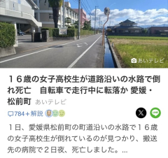 1 : 以下、?ちゃんねるからVIPがお送りします :2025/11/03(月) 22:49:11.273 ID:87ovI0ZK0.net16歳の女子高校生が道路沿いの水路で倒れ死亡 自転車で走行中に転落か 愛媛・松前町(あいテレビ) - Yahoo!ニュース転載元スレッド:…