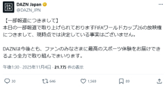 1: 名無し@サカサカ10  2025/11/04(火) 14:13:32.72    スポーツチャンネル「DAZN」が11月4日、2026年に開催される北中米ワールドカップ(W杯)について「一部報道で取り上げられておりますFIFAワールドカップ26の放映権につきまして、現時点では決定している事実はございません」と公式X(旧ツイッター)で声明を発表した。     4日にDAZNとNTTドコモが共同取得と一部報道がなされていたなかで、DAZNが4日の午後に公式Xを更新。北中米W杯の放映権について「現時点では決定している事実はございません」と声明を発表。そして、「今後とも、ファンのみなさまに最高のスポーツ体験をお届けできるよう全力で取り組んでまいります」とまとめた。     DAZNが発表した声明の全文は以下のとおり。    「本日の一部報道で取り上げられておりますFIFAワールドカップ26の放映権につきまして、現時点では決定している事実はございません。     DAZNは今後とも、ファンのみなさまに最高のスポーツ体験をお届けできるよう全力で取り組んでまいります」…