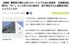 1 :                                  11月3日午前、兵庫県西宮市で警察官が橋から約14メートル下の谷に転落しました。警察官は消防に救助されましたが、搬送先の病院で死亡が確認されました。    3日午前8時半すぎ、西宮市塩瀬町名塩で「警察官が橋から落ちた」と別の警察官から消防に通報がありました。警察によりますと、現場の国道176号の尼子谷橋ではトラック同士が事故を起こしていて、西宮警察署の地域第三課に所属する警察官2人が処理を行っていました。その際、片方の警察官が「わー」という声を聞いて振り向いたところ、一緒に事故処理に当たっていた54歳の男性警部補の姿が見えなくなっていて、事故を起こしたトラック運転手が橋から転落する警部補の姿を目撃したということです。  警部補は当時、事故を起こしたトラックの車検証や自賠責保険などの書類を確認していましたが、風に飛ばされた書類を回収しようとして誤って約14メートル下の谷の雑木林に転落したとみられています。                                                                2 :                                  欄干乗り越えて書類取ろうとして落ちたんか  悲惨やなぁ…