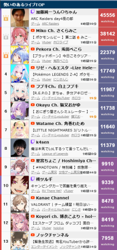 引用元: 289: Vtuberまとめ2025/11/04(火) 22:29:05.78 あっこりゃあああ 299: Vtuberまとめ2025/11/04(火) 22:29:25.63 >>289 みこち加藤に負けてて草 312: Vtuberまとめ2025/11/04(火) 22:29:43.58 >>289 加藤純一最強! 314: Vtuberまとめ2025/11/04(火) 22:29:44.80 >>289 ぺこらもうみこちに勝てないんだな 331: Vtuberまとめ2025/11/04(火) 22:30:09.19 >>289 加藤に負けてるとか新陳代謝が起きてないよな 結局いつもの面々だし 344: Vtuberまとめ2025/11/04(火) 22:30:25.00 >>314 でも2位だよ あれだけやらかしてこれはすごいよ 353: Vtuberまとめ2025/11/04(火) 22:30:36.63 >>289 加藤純一最強!加藤純一最強! さくらみこ強い!さくらみこ強い! 兎田ぺこらCパート!兎田ぺこらCパート! 384: Vtuberまとめ2025/11/04(火) 22:31:13.87 >>314 単独で見たらそりゃーまぁこうなるよねって 406: Vtuberまとめ2025/11/04(火) 22:31:40.90 >>353 えー、ぺこら本パートです…w 439: Vtuberまとめ2025/11/04(火) 22:32:31.84 >>406 兎田ぺこらCパート!兎田ぺこらCパート!…