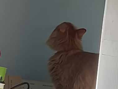 棚の上を物色する猫さん。 オヤツがここにあるのは 知ってるニャ♪ すると……
