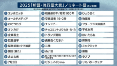 転載元: それでも動く名無し 2025/11/05(水) 17:04:43.33 ID:pRBKVk9k0 ▽ノミネート語30リスト(50音順) エッホエッホ オールドメディア おてつたび オンカジ 企業風土 教皇選挙 緊急銃猟/クマ被害 国宝(観た) 古古古米 7月5日 戦後80年/昭和100年 卒業証書19.2秒 チャッピー チョコミントよりもあ・な・た トランプ関税 長袖をください 二季 ぬい活 働いて働いて働いて働いて働いてまいります/女性首相 ビジュイイじゃん ひょうろく 物価高 フリーランス保護法 平成女児 ほいたらね 麻辣湯 ミャクミャク 薬膳 ラブブ リカバリーウェア ※ 2: それでも動く名無し 2025/11/05(水) 17:05:20.56 ID:SA/p/ENU0 お前ら毎年同じこと言ってるよな…