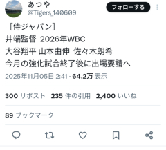【速報】大谷翔平、山本由伸、佐々木朗希に赤紙が届く