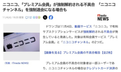 1 : ドワンゴは11月4日、動画サービス「ニコニコ」で有料サブスクリプションサービスが強制解約される不具合が発生していると発表した。対象は有料会員サービス「プレミアム会員」と「ニコニコチャンネル」の2つだ。 プレミアム会員の不具合の対象者は一部ユーザーであり、ニコニコチャンネルの場合はクレジットカード決済の一部利用者が対象。ドワンゴはいずれの原因も明かしておらず、現在調査を進めている。 2 : 感謝、 3 : ニコ動なんて70代以上しか見てねえだろ、 17 : >>3 YouTubeから最近帰ってきてる人が増えてるんだと…