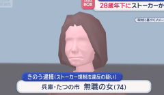 1: 名無しさん@ 2025/11/06(木) 19:33:49.48 ID:DlwtiM4J0● BE:567637504-PLT(56555) ストーカー行為を繰り返したとして5日逮捕されたのは、近所に住む無職の女(74)。 男性の28歳年上です。 男性との間に一体、何が…。 男性とはあいさつを交わす程度の仲だったという女。こう供述しているといいます。 逮捕された女 「男性の交際相手に嫉妬した。男性にも嫉妬した」 交際相手と別れさせるためにストーカー行為を続けたと (略) 引用元ソース 2: 名無しさん@ 2025/11/06(木) 19:36:11.90 ID:fw+mODCg0 年齢差が親子じゃん 3: 名無しさん@ 2025/11/06(木) 19:38:56.17 ID:mPciAJGP0 怖いねんて 4: 名無しさん@ 2025/11/06(木) 19:39:29.37 ID:6Dz2wVFa0 おばあちゃんじゃん 5: 名無しさん@ 2025/11/06(木) 19:39:43.92 ID:xs/L5NoY0 若く見えるとかちやほやされて無駄に理想高くなって行き遅れた勘違い女の成れの果てだろこれ 6: 名無しさん@ 2025/11/06(木) 19:43:47.12 ID:wrgRgXq00 妖怪かよ こわ 8: 名無しさん@ 2025/11/06(木) 19:59:22.25 ID:UkS4CORk0 大体男だから珍しいな 10: 名無しさん@ 2025/11/06(木) 20:26:48.39 ID:sw1VSeM10 毎日同じ日常だと年老いても精神年齢は老いないから… 引用元…
