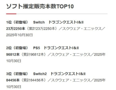 転載元: それでも動く名無し 2025/11/06(木) 22:21:32.71 ID:bGVJ0DWr0 >>首位に輝いたのは、HD-2D版『ドラゴンクエストI&II』。 Nintendo Switch版が1位、プレイステーション5版が2位、Nintendo Switch 2版が3位と、トップ3を独占しており、 3機種の合計販売本数は41万3518本という好調な滑り出しになった。 2: それでも動く名無し 2025/11/06(木) 22:21:47.73 ID:bGVJ0DWr0 1位(初登場) Switch ドラゴンクエストI&II 23万2250本(累計23万2250本)/スクウェア・エニックス/2025年10月30日 2位(初登場) PS5 ドラゴンクエストI&II 96812本(累計96812本)/スクウェア・エニックス/2025年10月30日 3位(初登場) Switch2 ドラゴンクエストI&II 84456本(累計84456本)/スクウェア・エニックス/2025年10月30日 3: それでも動く名無し 2025/11/06(木) 22:22:05.28 ID:ri2NrCpQM ええやん…