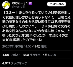 1: 2025/11/07(金) 10:16:55.42 「ええー!彼女を作るっていうのは勇気を出して女性に話しかける行為じゃなくて 日常で交流のある女性の中から深い関係になる相手を選ぶ行為だったのかい?」「じゃあ日常で交流のある女性なんかいないから永遠に無じゃん」と悟ったのが20代後半でしたが 本当にそのまま10年経過したので怖いね— ねおらー31♎ (@neora31) November 6, 2025 ※関連記事 【画像】この漫画の「ダメ人間」と付き合っている彼女の話、少し怖くて草wwwww…