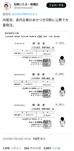 1 名前:名無しさん@涙目です。[] 投稿日:2025/11/07(金) 11:02:29.48 ID:Hv1UUCSE0 日本共産党が大量に政務活動費で広報誌を発注 発注先のあかつき印刷さん 親族で大量に寄付 2 名前:名無しさん@涙目です。[] 投稿日:2025/11/07(金) 11:04:10.46 ID:venNMuhL0 ブーメラン確実に予測できるのになんであんな記事出したん? 13 名前:名無しさん@涙目です。[] 投稿日:2025/11/07(金) 11:10:04.09 ID:RZkD5R750 >>2 信者の結束は硬い、テレビ新聞は取り上げない 216 名前:名無しさん@涙目です。[sage] 投稿日:2025/11/07(金) 16:39:54.54 ID:Zh3YQJsL0 >>13 逆に言うと裏切り者は滅多打ちだからねえ 勿論今どきはギリギリの社会的滅多打ちだろうけど 5 名前:名無しさん@涙目です。[sage] 投稿日:2025/11/07(金) 11:05:04.30 ID:kN/4TO0S0 そこの役員が共産党に多額の寄付なんだっけ? 藤田じゃなくこれが税金の還流というものではないのか?w 3 名前:名無しさん@涙目です。[] 投稿日:2025/11/07(金) 11:04:16.92 ID:0qg8riUu0 献金じゃなくて寄付ですから 55 名前:名無しさん@涙目です。[sage] 投稿日:2025/11/07(金) 11:37:20.69 ID:t215Mxja0 >>3 同じ 223 名前:名無しさん@涙目です。[] 投稿日:2025/11/07(金) 17:19:54.93 ID:e81Tz9Lz0 >>3 寄付したあかつき印刷さんに、本部から億超えの支出がされてますけどね。 他にも、あかつき印刷以上の金額を支出してる企業あるよ。 その企業の社長さんも少額だけど寄付してる。 ※最高額が、キリのいい数字で99.900.000円。 224 名前:名無しさん@涙目です。[] 投稿日:2025/11/07(金) 17:21:06.06 ID:e81Tz9Lz0 >>223 ミス 共産党からその企業に支出してる金額ね 22 名前:名無しさん@涙目です。[sage] 投稿日:2025/11/07(金) 11:16:00.53 ID:+5HNHkjh0 >>1 個人の献金にしては額が多すぎるな まさか企業の売上を個人献金という形で寄付させているんじゃないだろうな 155 名前:名無しさん@涙目です。[] 投稿日:2025/11/07(金) 12:39:01.51 ID:HkWrJYun0 >>22 答え書いちゃあかんやん(笑) 24 名前:名無しさん@涙目です。[sage] 投稿日:2025/11/07(金) 11:16:49.99 ID:4ddRqTZC0 共産党擁護するわけじゃないが 党員の党費が原資の党と税金が原資の党じゃ全然違うとはオモタ! 26 名前:名無しさん@涙目です。[] 投稿日:2025/11/07(金) 11:20:02.96 ID:34mq5ON40 >>24 それ言うと献金とパー券の比率が高い自民党は問題ない側になるが 83 名前:名無しさん@涙目です。[sage] 投稿日:2025/11/07(金) 11:51:37.00 ID:PdLmxyBe0 政務活動費→印刷屋→共産党 政党助成金に頼らないってのも大変だな 88 名前:名無しさん@涙目です。[] 投稿日:2025/11/07(金) 11:57:49.87 ID:zFAQ0XAW0 >>83 ポスター代は政党交付金と無関係に 印刷屋が請求するんだよ 106 名前:名無しさん@涙目です。[sage] 投稿日:2025/11/07(金) 12:10:07.62 ID:PdLmxyBe0 >>88 「朝霞市議団ニュース」ってポスターなのかね? 昨日だか見積書も出てたよね 20000枚近くもどこに貼ってんのかな 6 名前:名無しさん@涙目です。[] 投稿日:2025/11/07(金) 11:05:33.52 ID:Sk8OwxgZ0 政党交付金の話は? 63 名前:名無しさん@涙目です。[] 投稿日:2025/11/07(金) 11:40:32.29 ID:+HJMcfCG0 >>6 選挙時のポスターや選挙はがきの費用も税金だけど こっちは共産党もちゃんと受け取ってるんだぜ (正確には候補者が発注し、業者が選管に請求する) 長野の市議選挙でも大阪の身内企業に発注し 市側に「市内に金を落とせ」と文句言われてるんやで 72 名前:名無しさん@涙目です。[sage] 投稿日:2025/11/07(金) 11:44:21.42 ID:0AyweXj20 >>63 市議会議員選挙だとしない業者への発注は尚更よな 掘れば日本全国そこら中で出てくると思うわ 79 名前:名無しさん@涙目です。[sage] 投稿日:2025/11/07(金) 11:49:35.05 ID:Jbgp7GYO0 共産党が業者を価格や印刷品質で公平に選んでそこが層化系だったら決めた奴除名だろ?身内から選んで何が悪い?って話だろうに、あ? 87 名前:名無しさん@涙目です。[] 投稿日:2025/11/07(金) 11:56:52.34 ID:zFAQ0XAW0 >>79 そもそも選挙ポスター受けてくれるところが無いだろ 満期の自治体選挙なら半年前から予約も出来るが衆院選みたいに 中途解散があたりまえで告示日まで最長4週間しか無いとかだと印刷屋だって受けてくれない 131 名前:名無しさん@涙目です。[] 投稿日:2025/11/07(金) 12:23:59.71 ID:+HJMcfCG0 >>87 長野県佐久市の市長さんが、地元でやってくれって言ってるよ 【日本共産党の行動に疑問•長野3区】 地方経済の再生を声高に訴えている一方で、ポスター作成は、長野3区内では行わず大阪の会社で。 🍎衆議院選挙ポスターは、公費(国民の税金)によって作成されています。 🍎長野3区のポスター掲示ヶ所は、2,856ヶ所 地域経済発展にご協力を 40 名前:名無しさん@涙目です。[] 投稿日:2025/11/07(金) 11:31:08.50 ID:JwJSxd7M0 赤旗関西版の印刷会社は役員の息子が共産党市議 こっちもよろしく 46 名前:名無しさん@涙目です。[] 投稿日:2025/11/07(金) 11:33:18.17 ID:+qYVPlMZ0 >>1 この情報から、同一人物および親族である確証ってどうやって得るの? 215 名前:名無しさん@涙目です。[sage] 投稿日:2025/11/07(金) 16:37:52.79 ID:Zh3YQJsL0 >>46 それを赤旗さんが調べるべきよねえ 60 名前:名無しさん@涙目です。[] 投稿日:2025/11/07(金) 11:39:16.52 ID:gftiIws60 >>1 赤旗編集長「共産党に問題があ