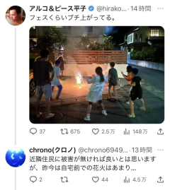 アルコ&ピース平子「子供達と住宅街で花火。大盛り上がりで最高」X民「近所迷惑では?」→結果