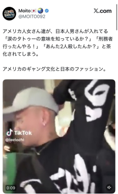 1: 2025/11/08(土) 18:21:44.71 アメリカ人女さん達が、日本人男さんが入れてる「涙のタトゥーの意味を知っているか?」「刑務者行ったんやろ!」「あんた2人殺したんか?」と茶化されてしまう。アメリカのギャング文化と日本のファッション。 pic.twitter.com/DMtTKqHgi4— Moito🇯🇵🌏 (@MOITO092) November 2, 2025 ※関連記事 【画像】集合住宅でBBQする陽キャ家族wwwwwwwww…