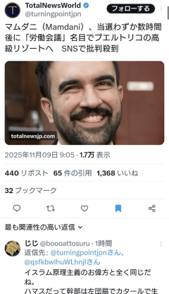 1:2025/11/09(日) 12:28:25.29 ID:kRln0BQ+0マムダニ(Mamdani)、当選わずか数時間後に「労働会議」名目でプエルトリコの高級リゾートへ SNSで批判殺到— TotalNewsWorld (@turningpointjpn) November 9, 2025転載元スレッド:…