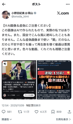 1:エルビテグラビル(茸) [DE]:2025/11/09(日) 16:14:11.63 ID:j3m8lbf10 BE:271912485-2BP(2000) 【※AI画像&虚偽にご注意ください】 この画像はAIで作られたもので、実際の私ではありません。また、国会でこんな風に絶叫したこともありません。こんな虚偽画像まで使い「闇」だのなんだのと不安や怒りを煽って再生数を稼ぐ動画は悪質だと思います。色々な動画、くれぐれも視聴ご注意ください。 5:エンテカビル(ジパング) [VE]:2025/11/09(日) 16:15:17.69 ID:F7wWm3iV0 パヨが作った駄AI動画あるよな タイトルですぐわかるからクリックすらしてないが 6:アメナメビル(やわらか銀行) [CN]:2025/11/09(日) 16:16:14.27 ID:tNJTbYt70…