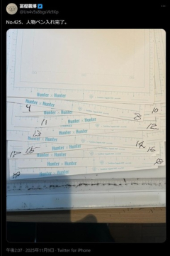 74: 名無し 2025/11/09(日) 14:09:30.10 ID:VUV6FlFt0 2週間ぶりに冨樫来たぞ 冨樫義博@Un4v5s8bgsVk9XpNo.425、人物ペン入れ完了。…