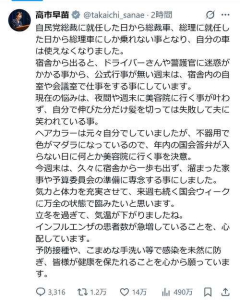 1. 匿名@ガールズちゃんねる 高市氏はこうした対応を理由に、「宿舎から出ると、ドライバーさんや警護官に迷惑がかかる事から、公式行事が無い週末は、宿舎内の自室や会議室で仕事をする事にしています」とし、「現在の悩みは、夜間や週末に美容院に行く事が叶わず、自分で伸びた分だけ髪を切っては失敗して夫に笑われている事」と明かした。前髪を斜めに流し、全体を短く切り揃えたおなじみのショートスタイルは、自分で整えているという。 その上で、「ヘアカラーは元々自分でしていましたが、不器用で色がマダラになっているので、年内の国会答弁が入らない日に何とか美容院に行く事を決意」とした。 2025/11/09(日) 14:40:46…