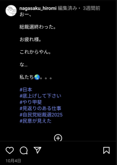 【悲報】女優の永作博美さん(55)、インスタで高市支持をほのめかす…
