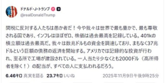 728: 名無し 2025/11/09(日) 21:34:18.08 ID:HblKIako0 TRUMP PROPOSES $1,000–$2,000 TARIFF “DIVIDEND” FOR AMERICANS •HE SAID AMERICANS COULD RECEIVE CHECKS WORTH $1,000 TO $2,000, FUNDED BY TARIFF REVENUES. トランプ大統領、米国民に1000~2000ドルの関税「配当」を提案 •関税収入を財源に、米国民が1000~2000ドル相当の小切手を受け取れると発言。 アメリカに渡米だ(´・ω・`)…