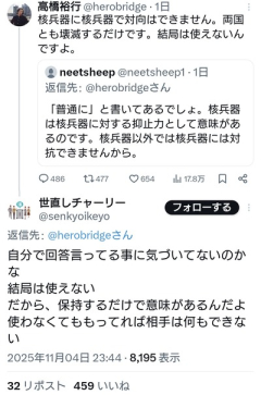 1 名前:名無しさん@涙目です。[sage] 投稿日:2025/11/06(木) 08:43:04.26 ID:hNazFxVx0 2 名前:名無しさん@涙目です。[sage] 投稿日:2025/11/06(木) 08:44:03.14 ID:+PrFIEw40 抑止力だよね 良く分かってるじゃん 221 名前:名無しさん@涙目です。[] 投稿日:2025/11/06(木) 11:09:36.81 ID:ScUPUdaO0 >>2 w 549 名前:名無しさん@涙目です。[sage] 投稿日:2025/11/06(木) 15:30:07.42 ID:PUkuFWoj0 >>2 散々昔から言われてたことだよな 26 名前:名無しさん@涙目です。[sage] 投稿日:2025/11/06(木) 08:53:13.37 ID:e4mzBE770 使うつもりなのかコイツ 7 名前:名無しさん@涙目です。[sage] 投稿日:2025/11/06(木) 08:46:20.84 ID:F0j2zysJ0 それが目的だからね え?まさか使う為に持つと思ってたの? 39 名前:名無しさん@涙目です。[sage] 投稿日:2025/11/06(木) 08:58:06.73 ID:RgUTbhKp0 >>7 敵にそれがわかったら持つ意味ないじゃんバカじゃね? 195 名前:名無しさん@涙目です。[] 投稿日:2025/11/06(木) 10:51:56.50 ID:9vS4cNpZ0 >>39 アホがいた 59 名前:シ[] 投稿日:2025/11/06(木) 09:12:01.71 ID:VdsM10+Q0 >>39 何言ってんだこいつ? 350 名前:名無しさん@涙目です。[] 投稿日:2025/11/06(木) 12:21:34.20 ID:Sb2KOhDs0 >>39 パヨさあ… 105 名前:名無しさん@涙目です。[] 投稿日:2025/11/06(木) 09:47:20.75 ID:FU+6pS/r0 >>39 ? 脳内お花畑なのか? 181 名前:名無しさん@涙目です。[sage] 投稿日:2025/11/06(木) 10:39:19.61 ID:C9r8qfkl0 >>39 必ず不自然な日本語なのはボケなの?ルールなの? 342 名前:名無しさん@涙目です。[] 投稿日:2025/11/06(木) 12:17:13.02 ID:RmXSVZb70 持ってたら使うって考えの方なのかな ふう怖い怖い 359 名前:名無しさん@涙目です。[] 投稿日:2025/11/06(木) 12:27:26.20 ID:5F20Gbn50 >>342 使わないの? なら「相手国の核兵器」なんぞに恐れず、日本は引き続き非核三原則を継続しても問題ないな 361 名前:名無しさん@涙目です。[sage] 投稿日:2025/11/06(木) 12:28:18.94 ID:ShtVr9+M0 >>359 いつでも使えるという事が大事なので 3 名前:名無しさん@涙目です。[sage] 投稿日:2025/11/06(木) 08:45:08.31 ID:juVCdayZ0 片方だけ持ってる場合はどうなるのっと 570 名前:名無しさん@涙目です。[] 投稿日:2025/11/06(木) 16:03:10.34 ID:EjfsRX320 >>3 みずぽ「9条があれば」 594 名前:名無しさん@涙目です。[] 投稿日:2025/11/06(木) 16:19:59.17 ID:Szwup3pg0 >>570 プーチンに説得しに行かせよう 今すぐ憲法改正し憲法9条を取り入れなさい。そうすれば戦争はなくなります。 と 11 名前:名無しさん@涙目です。[sage] 投稿日:2025/11/06(木) 08:47:17.07 ID:5zriiwFG0 片方だけなら使っちゃおうかな、脅しちゃおうかな、ってなるじゃん 261 名前:名無しさん@涙目です。[] 投稿日:2025/11/06(木) 11:28:50.02 ID:6i+gNe4X0 >>11 ウクライナは核を放棄した結果、 ロシアに攻め込まれたね 210 名前:名無しさん@涙目です。[] 投稿日:2025/11/06(木) 11:03:09.85 ID:O/jbpI4e0 日本は非核三原則と専守防衛の国だ ミサイル防衛の充実こそが 日本の国情に合う最も現実にとりうる道だ 核保有核保有と吠えるな 302 名前:名無しさん@涙目です。[] 投稿日:2025/11/06(木) 12:02:16.57 ID:oeHHi79H0 >>210 攻められない状況を作ることこそ、最大の専守防衛じゃないか。 222 名前:名無しさん@涙目です。[] 投稿日:2025/11/06(木) 11:10:03.23 ID:h723Wm330 >>210 だからミサイルも撃たせないために核保有が必要って話やろ ロシアみたいに核使えないんじゃねーの?って思われたらドローンで空爆される インフラ狙われた時点で自国内のクルスク戦線で戦術核使ってれば今の状況になってない 138 名前:名無しさん@涙目です。[sage] 投稿日:2025/11/06(木) 10:10:41.25 ID:s/jtvYwM0 日本の場合、抑止力目的で持っても普通に核攻撃されて、即時に反撃できなくて一方的にやられそう 140 名前:名無しさん@涙目です。[sage] 投稿日:2025/11/06(木) 10:13:05.28 ID:ShtVr9+M0 >>138 原潜買うから大丈夫 146 名前:名無しさん@涙目です。[] 投稿日:2025/11/06(木) 10:15:23.79 ID:kE4xTbDg0 >>138 だから原潜なんだよ 日本を滅ぼすなら滅ぼせばいい でもお前らも確実に道連れにする これ 163 名前:名無しさん@涙目です。[] 投稿日:2025/11/06(木) 10:28:36.25 ID:NYEEMoUt0 核保有論者は ・我が国に埋蔵ウランが殆どないこと ・NPT脱退したらウラン輸入できなくなること ・水爆を維持するためのトリチウムを継続的に供給できないんで、備蓄プルトニウムだけだとプルトニウム爆弾しか作れないこと ・備蓄プルトニウムだけでは原潜も持てないこと ・核保有国が実戦配備してる核は殆どが強力で小型な水爆である一方、我が国が製造、維持できるのはプルトニウム型の「巨大な戦術核」でしかないこと ・低威力のプルトニウム爆弾だけで周辺国の核戦力と均衡をとるには、山岳部に1000基以上のサイロやTELを即応状態で配置しないといけないこと ・それに満たない中途半端な核戦力しか持たなくても、その代償として周辺国や西側社会からの決別は避けられないのだから、米の核の傘に依存し続けた方がよっぽどコスパがいいこと これらの現実をちゃんと認識してるの? 167 名前:名無しさん@涙目です。[] 投稿日:2025/11/06(木) 10:29:49.09 ID:NYEEMoUt0 >>163 ああこれを忘れてた ・核保有のためにNPT脱退したら、核燃料を継続的に消費する原子力分野は死滅すること