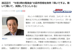 1: 名無し 2025/11/10(月) 11:57:08.97 ID:yBuIbbiP9 タレントの渡辺正行(69)が10日、フジテレビ系「サン!シャイン」に出演し、 高市早苗首相が午前3時から行った勉強会について「偉いですよ。働いて働いて、実践してらっしゃる」と称賛した。 高市首相は7日、衆院予算委員会の答弁準備のため、午前3時から秘書官らと約3時間の“深夜勉強会”を実施。 省庁の答弁書作成が遅れていたため、「秘書官やSPに迷惑をかけた」と説明していた。 渡辺氏は「本当に働いて働いて実践してる。代わりがいない中で、やるしかないんです」と、 自身の仕事観を重ねながら評価した。 出典:スポニチ(Yahoo!ニュース)2025年11月10日 ■要約 高市早苗首相が予算委員会の答弁準備を午前3時から行った件について、タレントの渡辺正行氏がテレビ番組で称賛。 「働きすぎを心配する声がある中で、やるべき時にやる姿勢は立派」とコメントした。 一方、SNS上では「美談化するべきではない」「制度的な問題を隠すな」といった声もあり、 政府の働き方と行政の準備体制の是非が改めて議論されている。 ■解説 高市首相の“午前3時始動”は、政治家としての責任感の表れと見る向きがある一方で、 背景には質問通告の遅れや官僚側の答弁作成の逼迫といった、根深い国会運営の問題がある。 渡辺氏のような芸能界からの評価は「努力を称える文化」を象徴しているが、 同時に「長時間労働を美化する風潮」への懸念も根強い。 首相の働き方を礼賛するだけでなく、 行政全体の効率化や議会ルールの見直しが求められていることを見落としてはならない。 【葛飾区議選】参政党29歳トップ当選 「日本人ファースト」主張 【速報】 自民党「やっぱり公明党がいい。一番親和※が高い」 【動画】 トラックの運転手がパワーゲートに挟まれてしまう事故。…