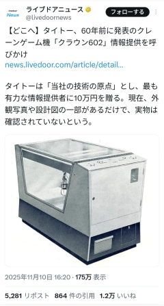 1 : 以下、?ちゃんねるからVIPがお送りします :2025/11/10(月) 21:48:10.905 ID:y73248/i0.net【どこへ】タイトー、60年前に発表のクレーンゲーム機「クラウン602」情報提供を呼びかけタイトーは「当社の技術の原点」とし、最も有力な情報提供者に10万円を贈る。現在、外観写真や設計図の一部があるだけで、実物は確認されていないという。 pic.twitter.com/jZWfzCO3Dw— ライブドアニュース (@livedoornews) November 10, 20252 : 以下、?ちゃんねるからVIPがお送りします :2025/11/10(月) 21:48:17.733 ID:y73248/i0.net知らね?転載元スレッド:…
