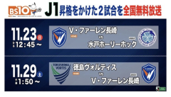 1: 阿弥陀ヶ峰 ★ 2025/11/12(水) 11:01:26.79 ID:CypXLLhL9 全国無料のBS放送局「BS10(ビーエステン)」は、11月23日と11月29日に開催されるV・ファーレン長崎の明治安田J2リーグ2試合を全国無料生中継すると発表した。 J2第36節を終えて2位につける長崎。11月23日は、現在リーグ1位でクラブ史上初となるJ1昇格がかかる水戸ホーリーホックと激突。さらに29日には、徳島ヴォルティスと対戦する。 各チームともに、それぞれ昇格がかかった運命の一戦となる2試合。7年ぶりに監督に復帰した高木琢也監督率いる長崎の大一番に注目が集まる。 ■放送スケジュール 11/23(日)V・ファーレン長崎 vs 水戸ホーリーホック(13:05 キックオフ) 【放送時間】 ・BS10・ひる 12:45~午後3:00 ※延長あり ・NHK長崎 ・長崎国際テレビ 11/29(土)徳島ヴォルティス vs V・ファーレン長崎(14:00 キックオフ) 【放送時間】 ・BS10・午後1:50~夕方4:00 ※延長あり ・NHK徳島…