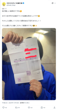 1: 2025/11/12(水) 09:34:25.390 はい!皆が嬉しい給料日ですね🤭まだ入社半年の20歳子でこの金額は羨ましいです🥺ちゃんと出勤してくれたら絶対40は下回りません!!そんな僕たちと働くスタッフ募集中ですよ😎✨ pic.twitter.com/6kX0r62DpP— キセキスタッフの独り言 (@Kiseki_Moja) November 10, 2025 ※関連記事 【衝撃】俺、月収170万超えた結果wwwwwwwwww…