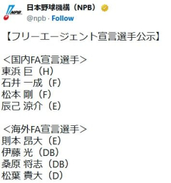 転載元: それでも動く名無し 2025/11/12(水) 15:06:12.22 ID:zjAcisrv0 【フリーエージェント宣言選手公示】 <国内FA宣言選手> 東浜 巨(H) 石井 一成(F) 松本 剛(F) 辰己 涼介(E) <海外FA宣言選手> 則本 昂大(E) 伊藤 光(DB) 桑原 将志(DB) 松葉 貴大(D) 2: それでも動く名無し 2025/11/12(水) 15:07:10.18 ID:zjAcisrv0 ※海外FAは国内FAも兼ねているので MLB行かずに他球団行く可能性もあります…