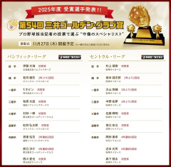 2: 名無しさん 2025/11/12(水) 17:01:23.642 ID:5UDxAbgXD パ・リーグ【投手】伊藤大海(28、日本ハム)131票 初受賞【捕手】若月健矢(30、オリックス)124票 2年ぶり2回目【一塁手】T.ネビン(28、西武)162票 初受賞【二塁手】牧原大成(33、ソフトバンク)103票 初受賞【三塁手】村林一輝(28、楽天)117票 初受賞【遊撃手】紅林弘太郎(23、オリックス)79票 初受賞【外野手】周東佑京(29、ソフトバンク)147票 2年連続2回目辰己涼介(28、楽天)129票 5年連続5回目西川愛也(26、西武)96票 初受賞 3: 名無しさん 2025/11/12(水) 17:01:35.606 ID:5UDxAbgXD 【投手】村上頌樹(27、阪神)122票 初受賞【捕手】坂本誠志郎(32、阪神)225票 2年ぶり2回目【一塁手】大山悠輔(30、阪神)244票 2年ぶり2回目【二塁手】中野拓夢(29、阪神)196票 2年ぶり2回目【三塁手】佐藤輝明(26、阪神)220票 初受賞【遊撃手】泉口友汰(26、巨人)165票 初受賞【外野手】岡林勇希(23、中日)228票 4年連続4回目 近本光司(31、阪神)218票 5年連続5回目森下翔太(25、阪神)127票 初受賞 …
