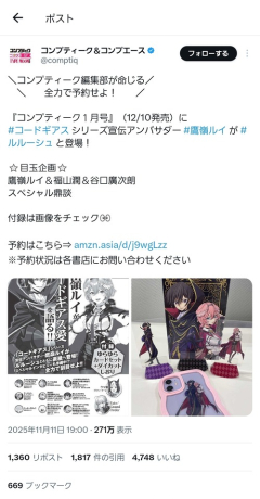 1: 2025/11/13(木) 08:54:11.596 \コンプティーク編集部が命じる/ \ 全力で予約せよ! /『コンプティーク1月号』(12/10発売)に#コードギアス シリーズ宣伝アンバサダー #鷹嶺ルイ が #ルルーシュ と登場!⭐目玉企画⭐鷹嶺ルイ&福山潤&谷口廣次朗スペシャル鼎談付録は画像をチェック👀予約はこちら⇒… pic.twitter.com/TiCLEGX84z— コンプティーク&コンプエース (@comptiq) November 11, 2025 🎉お知らせ🎉なんと!!!コンプティーク1月号にルルーシュと一緒に⁉️私が載ります📚✨こんなこと…あっていいのか…?まだ実感わいてないです💦しかもルルーシュ役福山さんとプロデューサー谷口さんとのスペシャルインタビューもあります👀‼️ 付録も最高✨\ 全力で予約せよ! / — 鷹嶺ルイ🥀ホロライブ (@takanelui) November 11, 2025 ギアスファン「ぎゃおおおおおおおおおおん!!!!!!😡😭😡😭😡😭」 ※関連記事 【悲報】Vtuber集団『ホロライブ』運営のカバー、決算を受けて株価が暴落してしまう…