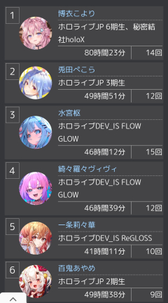 引用元: 176: Vtuberまとめ2025/11/13(木) 12:28:15.33 配信数減らすと公言してる星街が良心的に思えてきたわ 黙ってサボる奴が一番たち悪い 211: Vtuberまとめ2025/11/13(木) 12:28:57.54 >>176 百鬼あやめ10月配信時間貫禄の0時間😤 237: Vtuberまとめ2025/11/13(木) 12:29:24.91 >>211 この前のヴァロ大会で1年分働いただろ 281: Vtuberまとめ2025/11/13(木) 12:30:36.20 >>211 11月はエース級に働いてるが? 284: Vtuberまとめ2025/11/13(木) 12:30:39.67 >>237 また別の大会出るぞ 326: Vtuberまとめ2025/11/13(木) 12:31:39.52 >>281 1人もエースいなくて草 333: Vtuberまとめ2025/11/13(木) 12:31:49.34 >>281 これ何順? 412: Vtuberまとめ2025/11/13(木) 12:33:30.77 >>281 こよりほんま頑張ってるな 414: Vtuberまとめ2025/11/13(木) 12:33:32.33 >>333 配信回数順か 配信回数と配信時間の総合評価…