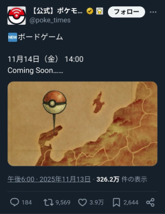 1: 2025/11/13(木) 22:14:48.37 🆕ボードゲーム11月14日(金) 14:00Coming Soon…… pic.twitter.com/RzouAGUpR7— 【公式】ポケモン情報局 (@poke_times) November 13, 2025 ※関連記事 【画像】この漫画の「ダメ人間」と付き合っている彼女の話、少し怖くて草wwwww…