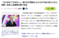1 : 吉本興業が運営する有料動画配信サービス「DOWNTOWN+(DT+)」の会員数が、10月24日の加入申し込みの受け付け開始から20日で50万人を突破したことが12日、分かった。 複数の関係者が明らかにした。 活動休止中だった松本人志(62)が約1年10か月ぶりの復帰の舞台としてDT+を選んだことで注目され、会員数の拡大につながったとみられる。 2 : また負けたのかワイらw 3 : 20万くらいやと思ってたから正直驚いたわ これで浜田がちゃんと松本と一緒に新コンテンツ始めたらもっと増えるやろ…