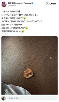 1: 名無しさん@ 2025/11/14(金) 19:14:01.14 ID:??? TID:SnowPig ロッテによる分析の結果、異物は「歯」と推定 大手菓子メーカー・ロッテの人気商品「チョコパイ」に異物が混入していたという投稿がネット上で拡散、物議を呼んでいる。 SNS上に投稿された写真には、人間の歯と思われる異物が収められている。 投稿者は続く投稿で、ロッテから送られてきたという異物の分析結果を公表。 資料の中では、結論として「試料は『歯』と推定される」と記されている。 (略) 引用元ソース ロッテのチョコパイ異物混入の件SNSだと歯が入るわけないって炎上してたら鑑定結果が歯だった…今回は結果がこんなに早く出るわけない勝手に結果をSNSに上げて良いのかとまた炎上してる… pic.twitter.com/GcKbbkIvjV— (◯д◯透)@本日誕生日 (@co604153) November 12, 2025 2: 名無しさん@ 2025/11/14(金) 19:14:27.10 ID:p1H7t やべーな 3: 名無しさん@ 2025/11/14(金) 19:14:54.72 ID:5nRdj はぁ? ナンチテ 9: 名無しさん@ 2025/11/14(金) 19:20:42.88 ID:oL6Ro 折れた自分の歯じゃないのか? 10: 名無しさん@ 2025/11/14(金) 19:24:55.97 ID:4POIN 窓越しで見学したことあるけど大手工場だから無人で手作業ではなく機械が大量生産してる。製造現場に人がいない。混入できない。 58: 名無しさん@ 2025/11/14(金) 20:15:00.98 ID:tAqSs >>10 24時間無人なわけではなく、定期的に止めて点検や清掃にも入っているから、その際に混入する可能性はあるのでは 11: 名無しさん@ 2025/11/14(金) 19:26:14.87 ID:rvHiv 自分の歯が欠けたとかじゃないの 20: 名無しさん@ 2025/11/14(金) 19:28:52.21 ID:jWAw1 は?なんだそりゃ 32: 名無しさん@ 2025/11/14(金) 19:41:25.03 ID:JZ0HN 製造段階で入った? マスクしてるから故意に入れなければ まず入らない 43: 名無しさん@ 2025/11/14(金) 19:49:08.97 ID:kkwLz 意味が分からないんだけどw 48: 名無しさん@ 2025/11/14(金) 19:51:18.42 ID:3dLu2 歯は流石に引くて 50: 名無しさん@ 2025/11/14(金) 19:51:56.21 ID:0Wun7 拡散した投稿について、ENCOUNTが13日にロッテに問い合わせたところ、同日中に文書で回答があった。回答では 「お客様からのご連絡を受け、当社で分析いたしました結果、歯と推定されました」と異物の分析結果を明示。 その上で、製造工程では作業員のマスク着用やX線による異物検出を徹底しており、製造日の検査記録を確認しても特筆事項はなかったとしている。また、今回の異物を製造工程内のX線異物検出装置に通したところ、正しく検知し工程外に排出されたという。 一連の調査結果を受け、回答では 「工程中の混入の可能性は極めて低いと考えられ、この度は混入原因を特定できず、苦慮しております。弊社といたしましてはご指摘を真摯(しんし)に受け止め、今後とも品質管理、衛生管理に万全を期し、お客様に安心してお召し上がりいただける製品作りに努めてまいります」としている。 70: 名無しさん@ 2025/11/14(金) 20:26:27.63 ID:pjtXj こんなん入るわけなくない? 79: 名無しさん@ 2025/11/14(金) 20:55:12.47 ID:46gxF 食うた奴の歯やろ 金沢のマクドでもあったやろ 82: 名無しさん@ 2025/11/14(金) 21:00:23.96 ID:oy6J3 遺伝子検査したら本人の歯でしたってオチなような気がする 93: 名無しさん@ 2025/11/14(金) 21:17:41.00 ID:LeOcY 歯が入るなんてあり得る?気持ち悪すぎ 104: 名無しさん@ 2025/11/14(金) 21:47:37.62 ID:GEGou さし歯が外れるんだろ 引用元…