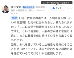 引用元: それでも動く名無し 2025/11/14(金) 17:12:32.92 ID:1jAp8ruQ0 13日の裁判で弁護側の証人として出廷した山上被告の母親は、証人尋問が始まる前に安倍元総理らへの謝罪の言葉を述べました。 (山上被告の母親) 「本来であれば事件が起きた後すぐにでも、謝罪しなければと思っていたけど、なかなかできなかった。きょうここに安倍元総理も来られているかもしれませんし、次男である徹也が大変な事件を起こしたことを心よりおわび申し上げます」 時折言葉を詰まらせながら話した母親。弁護人から現在、信仰している宗教を聞かれ、「世界平和統一家庭連合(旧統一教会)」と答えました。 ↓ 3: それでも動く名無し 2025/11/14(金) 17:15:21.47 ID:pRtY0FgC0 さんきゅー有識者 4: それでも動く名無し 2025/11/14(金) 17:16:20.07 ID:NjjI57DNa 駐車場に置いてあるんじゃね…