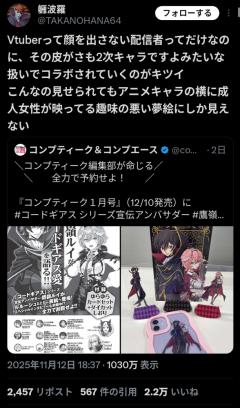 1: 名無しのアニゲーさん 2025/11/14(金) 09:03:27.170 ID:kIqvPBm54 1000万インプ引用からの1000万インプいいね6万やばいやろ何がそんなに気に食わないんや…