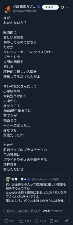 【悲報】勝ち組「クレカの種類にプライド持ってる人間、精神的に貧しいです」