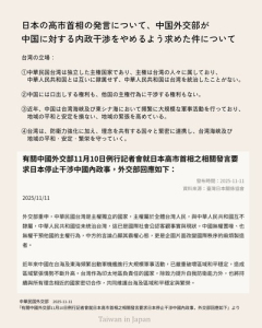 1: 名無し 2025/11/16(日) 13:54:12.09 ID:WWWokCas0 台北駐日経済文化代表処が公式Xを更新し、高市早苗首相の台湾有事発言をめぐる 中国側の抗議に対し「中国には口出しする権利はない」とする台湾の立場を発表。 台湾は「独立した主権国家」と強調し、中国の軍事行動が地域の緊張を高めていると批判した。 Yahoo!ニュース ■要約 ・台湾の対日窓口機関が、高市発言への中国の抗議に公式声明で反論。 ・「台湾は独立した主権国家、中国に干渉権はない」と強調。 ・中国の軍事行動が台湾海峡・東シナ海の緊張を高めていると批判。 ・理念を共有する国々(日本など)と連携し地域安定へ努力すると表明。 ■解説 台湾代表処がここまで明確に「中国には口出しする権利なし」と打ち返したのは注目に値する。 台湾が日本側に直接メッセージを向けたことで、 *今回の一連の騒動は“日中問題”というより“中台問題の延長線”* であることがより鮮明になった。 中国は高市首相の発言を口実に日本へ圧力をかけているが、 台湾側はむしろ「これは我々の主権問題であり、日本への発言を止める根拠はない」と強調している。 要するに、中国が日本を恫喝しようとしても、 当の台湾は「筋違い」と切り捨てているわけだ。 また声明の中で、台湾ははっきりと“中華人民共和国は台湾を統治したことがない”と指摘し、 中国の「一つの中国」主張を正面から否定した。 これは外交的にも相当踏み込んだ言い方で、日本への信頼アピールにもつながる。 日本としては、高市政権が示す姿勢―― *中国の圧力で発言を引っ込めず、台湾の立場も尊重する外交姿勢*―― が今回の件でより正当化された形だ。 中国の過剰反応がむしろ“台湾・日本・欧米”の連携強化を後押しする構図になっている。 加えて、中国は国内向けに強硬姿勢を演出しているが、 台湾側の発信力は以前より強く、国際社会へ直接説明できる状況が整った今では、 一方的に日本を悪者扱いする従来の手法が通じにくくなっている。 高市政権にとって今回の台湾の声明は、 *「日本の発言は国際社会に歓迎されている」という一つの裏付け*にもなる。 【w】中国国防部、日本人に向けた強そうなポエムで「粉骨砕身」をコミュニティノートで正されてしまう 弟の結婚式で祖母用に用意された車椅子に、送迎バスから降りた瞬間に誰かが勝手に座って立ち去った→スタッフも私たちも唖然とした件 【動画】 これは親が悪い。道路に飛び出した子供が車にはねられる事故。…