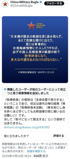 【プw】中国国防部、粉骨砕身という自国の故事の意味を取り違えコミュニティノートで正されてしまう