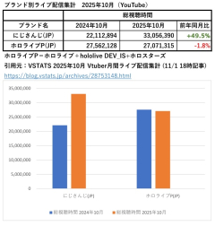 引用元: 231: Vtuberまとめ2025/11/17(月) 16:52:10.57 ホロがここ数年しょうもない内紛してた結果 271: Vtuberまとめ2025/11/17(月) 16:53:12.78 >>231 総視聴時間とかいうしょーもない指標使ってた会社が悪いよー 348: Vtuberまとめ2025/11/17(月) 16:55:20.44 >>271 あとアニメより多く提供あるから… 375: Vtuberまとめ2025/11/17(月) 16:56:10.18 >>231 ホロ~😭 389: Vtuberまとめ2025/11/17(月) 16:56:41.75 >>231 ホロとにじの差ってさ、お前ら有無じゃね? 405: Vtuberまとめ2025/11/17(月) 16:57:14.19 >>231 みかたがわからん 430: Vtuberまとめ2025/11/17(月) 16:58:03.27 >>231 何も成長していない 446: Vtuberまとめ2025/11/17(月) 16:58:27.70 >>389 ホロつまんなくてにじ見てるけど 459: Vtuberまとめ2025/11/17(月) 16:58:57.40 >>389 にじのほうがリスナーや箱推しを楽しませようと 色々企画を配信でやってくれるが ホロは株主の顔色ばっかうかがって集金に必死 463: Vtuberまとめ2025/11/17(月) 16:59:00.30 >>231 去年にも負けてんじゃん 467: Vtuberまとめ2025/11/17(月) 16:59:09.45 >>446 誰? 646: Vtuberまとめ2025/11/17(月) 17:03:54.65 >>231 JPにじは人数増えてるけどホロは減ってるからな…