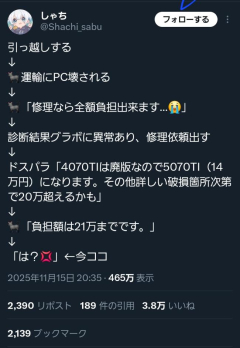 【画像】某大手運送、引っ越しで自作PCを破壊した挙げ句 補償拒否で大炎上wwwwwwwwwwwwwwwww