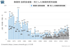 1 : 七波羅探題 ★ : 2025/11/17(月) 15:22:06.31 ID:7MjeeLX69 弁護士ドットコムニュース11月17日10時22分 約1600人のうち、わずか1人──割合にして0.06%。 2024年に仮釈放された無期懲役の受刑者が1人にとどまったことが、法務省が公表した最新の「矯正統計年報」でわかった。 日本には社会復帰の可能性を完全に閉ざす「終身刑」は存在しない。しかし、実際には無期懲役囚のほとんどが獄中で人生を終える状況が続いており、その実態が改めて浮き彫りになった。(弁護士ドットコムニュース・一宮俊介) ●これからは「無期拘禁刑」に名称変更 日本の刑罰は、死刑、懲役、禁錮、罰金、拘留、科料──と区分されてきた。このうち、期間を定めない懲役刑が「無期懲役刑」であり、死刑に次ぐ重い刑罰である。 国は今年6月、懲役刑と禁固刑を廃止し、「拘禁刑(こうきんけい)」に一本化した。これに伴い、無期懲役は今後「無期拘禁刑」として報じられるケースが増えていく見通しだ。 無期懲役と聞くと「一生死ぬまで刑務所に入る刑」と受け止められることが多いが、刑法28条は、無期懲役の受刑者でも、刑の執行開始から10年を経過し、本人に罪を悔い改める「改悛の情」があれば、仮に釈放することができると定める。 仮釈放後も、生涯にわたり国の指導下に置かれる点には変わりない。 ただし、2005年の法改正で有期刑の上限が20年から30年へ引き上げられたことなどを受け、近年は仮釈放までに30年以上服役する運用が一般的となり、無期受刑者の多くが塀の中で亡くなっている。 こうした運用を指して、「無期懲役が事実上の終身刑化している」との批判もある。 無期懲役受刑者について、仮釈放された数と死亡した数の推移。2024年の死亡者数はまだ公表されていない(クライムインフォのサイトより出力) ●受刑者3.3万人のうち無期は5% 刑が確定すると、受刑者は刑務所や拘置所といった刑事施設に収容されるが、現在どの程度の人数がいるのか。 国は、刑務所に収容されている受刑者の人数や罪名、新たに刑務所に入った人の数などを「矯正統計」として集計しており、月ごとの「月報」と、年ごとの「年報」を公表している。 今年7月に公表された最新版「矯正統計年報」(2024年)によると、2024年末時点で全国の刑事施設に収容されていた受刑者は3万3745人(男3万749人、女2996人)。そのうち無期懲役の受刑者は1650人(男1554人、女96人)で、全体の約5%を占める。 同年に刑事施設を出所した受刑者は1万5069人で、うち5480人が満期出所だった。一方、無期懲役の受刑者で出所(仮釈放)を許されたのはわずか1人だった。 ●無期囚の仮釈放、1975年は112人もいた 約1600人いる無期懲役囚のうち、塀の外に出られたのが1人だけという状況は、どれほど異例なのか。 死刑に関する資料をまとめているNPO「CrimeInfo(クライムインフォ)」のサイトを参考に調べると、記録が残る1966年以降で、仮釈放された無期受刑者が「0?1人」という年は確認できない。 1975年には112人の無期囚が仮釈放され、2001年までは毎年2ケタ台が続いていた。 しかし、2002年に8人に減少して以降、「1ケタの仮釈放」が珍しくなくなり、2ケタ台に乗ったのは、2003年、2005年、2013年、2015年、2017?2020年の8年間だけだ。 近年は、2021年9人、2022年6人、2023年8人と推移。そして2024年は1人まで落ち込んだ。逆に、獄中死する無期囚は増加傾向にあり、2022年41人、2023年30人が服役中に死亡している。 ●仮釈放というわずかな希望「受刑生活を耐える糧になる」 無期刑の終身刑化──。その現実を最も強く感じているのは、本人たちだ。 筆者が手紙のやりとりをしている複数の無期受刑者は、自身の刑を「時間をかけて行われる死刑」「終身刑と同じ」「死刑よりきつい」と表現する。 今年導入された拘禁刑は、1907年(明治40年)の刑法制定以来となる大きな刑罰体系の転換といわれる。 背景には、犯罪を繰り返す「再犯者率」の高止まりなどを踏まえて、これまでの「懲らしめ」から「立ち直り」重視へ方向転換するという国の考えがある。 そうした国の方向とは矛盾した状況に置かれているのが、無期受刑者たちだ。 社会復帰を励みに受刑生活を送る人は多いが、事実上、その希望が実現する可能性は極めて低く、刑務官たちも接し方や指導方法に苦慮しているという。 ある無期囚の男性は、筆者にこんな手紙を送ってきた。 「わずかな希望がこれからの長い受刑生活を耐えていく糧の一つになります」…