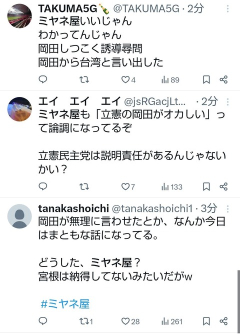 1: 名無しさん@ 2025/11/17(月) 17:31:00.253 ID:q8SRYia0d だんだん真実を述べるテレビが出てきたぞ。サナエ支持!「『台湾』は高市総理から言ったのではない」読売テレビ解説委員、岡田元外相との質疑めぐり指摘高岡氏「宮根さん、正確にしておきたいんですけど」… pic.twitter.com/JmKqKCWtCo— Necoぢぃ🐈 (@NecoZi3) November 17, 2025 5: 名無しさん@ 2025/11/17(月) 17:33:13.847 ID:+viQxccR0 発言の是非を問うのだったら 立憲が戦犯だよなあ 15: 名無しさん@ 2025/11/17(月) 17:51:45.764 ID:33hno2HK0 一応今回のことで立憲は祝杯をあげてそうだな だが国民は立憲に対して怒りを抑えられなくなりつつあるから 47: 名無しさん@ 2025/11/17(月) 18:44:13.946 ID:YU7cwQuD0 まあ立憲は解党でいいよな …