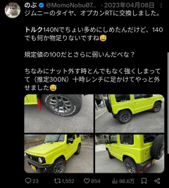 ■Xより 鍵掛かっちゃったので pic.twitter.com/tahZDNh6MJ— ろいち (@RoichiD21) November 16, 2025 どんな無茶したらそうなるんだ?と思って画像よく見たら…ジャッキアップ前に全車輪のホイールナット外してるやんけ pic.twitter.com/OpuA6B8Xns— ろいち (@RoichiD21) November 15, 2025 ジャッキ外れた、じゃなくてフロント上げたら後輪外れてリア着地→フロントに噛ましたジャッキが動いた、って感じでしょうね前にもオーバートルクでナット締め上げた挙句走行中に飛ばして物損事故起こしてたそうなので根本的に何かがイカレてますね…— ろいち (@RoichiD21) November 15, 2025 こいつの本当に駄目なところは、2年前にもDIYでやらかして、また今回も死人が出かねないミスをやらかしてるところ。下手とかいうレベルではなく、壊滅的にセンスがない。普通は2年あればもう少しまともに成長する。こういう人は他人の命に関わるので、金輪際車は触らないでもらいたい。 pic.twitter.com/xSAA52OdTn— 好き勝手に車を語るアカウント (@talking_car) November 16, 2025 ジムニー乗りのやべーやつ代表「のぶ」アカウント削除して逃亡した模様まともにタイヤ交換ボルト締めもできないアホは工具握んなよ(笑) つか公道に出んな2023年にオーバートルクで弾け飛んだボルトで他車を損壊2025ジャッキだけで前後同時上げ⇨墜落事故馬鹿としか言えねぇ・・ pic.twitter.com/L2mMJJ0tBY— マグロマン (@tXgpqhXPBJ23597) November 16, 2025…