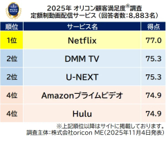 1: muffin ★ 2025/11/17(月) 23:29:07.97 ID:kpi5TYDB9 11/17(月) 16:17 オリコンが今月発表した「定額制動画配信サービスの満足度調査」によると、国内勢のU-NEXTとDMM TVが同点で総合2位に浮上し、初の総合TOP3入りを果たした。 調査は2017年から9回目の発表で、2ヶ月以上継続登録し料金を把握して利用しているユーザー8883人から回答を得た。総合1位は海外プラットフォームとして「Netflix」が3年連続7度目となるNetflixが獲得した。 Netflixは満足度77.0点を記録し、評価項目別では「アプリ・サイトの使いやすさ」「動画の見やすさ」「コンテンツの充実さ」の3項目で1位となった。特に利用者が重視する傾向が最も高い「動画の見やすさ」では79.9点を記録し、調査開始以来9年連続の1位を維持している。 一方、総合2位に浮上したU-NEXTは75.3点で、前回の総合5位から順位を大きく上げた。2020年の最高4位を上回り、初の総合TOP3入りを記録している。 同サービスは今回すべての評価項目で前回を上回る得点を獲得し、特に「コンテンツの充実さ」では75.1点でNetflixと0.7ポイント差の2位評価を得た。利用者からは「配信本数が多くて、観たいものがU-NEXTにある場合が多い」「ポイントが勝手に貯まるのでお得!」といった声が寄せられた。 さらに、国産のサービスという所が、他のものに比べて少し安心できる」といった国産サービスを評価する意見もあった。 同じく総合2位となったDMM TVは、前回の総合7位から大幅にランクアップした。プラットフォームとしては比較的新興ながらも月額550円というコスパの良さが話題になり、評価項目別でも「コストパフォーマンス」では前回に続いて2年連続の1位を獲得している。 利用者からは「アニメの本数に対して、料金の安さでコストパフォーマンスに優れている」「かなり安い上にアニメをメインに色々観られる」との評価が集まった。いずれも「Amazonプライムビデオ」などを上回る満足度となっている。 引用元:…