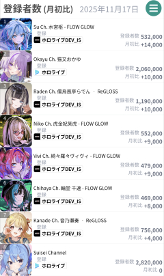 引用元: 231: Vtuberまとめ2025/11/18(火) 12:31:38.72 登録者伸びなくなったなぁ 250: Vtuberまとめ2025/11/18(火) 12:32:12.44 >>231 わりと本体はデバイスの乱に対応した方が良い 287: Vtuberまとめ2025/11/18(火) 12:33:03.91 >>231 デバイスは普通に伸びてるぞ JPが情けないだけ 356: Vtuberまとめ2025/11/18(火) 12:35:10.73 >>287 すうたや最強! 357: Vtuberまとめ2025/11/18(火) 12:35:12.38 >>287 リオナ・・・・? 377: Vtuberまとめ2025/11/18(火) 12:35:49.89 >>287 すいマリが伸びなくなったらもう終わりだよ 400: Vtuberまとめ2025/11/18(火) 12:36:44.28 >>287 りおーなまじで50万行く前に新人に抜かされそうだな 415: Vtuberまとめ2025/11/18(火) 12:37:21.97 >>400 まだはじめ√があるから心配していない 461: Vtuberまとめ2025/11/18(火) 12:39:01.69 >>287 すいせいピタッと止まったのなんで? 843: Vtuberまとめ2025/11/18(火) 12:49:34.21 >>287 すいちゃんちょっと前は4ヶ月で10万くらい増えてたのに草…