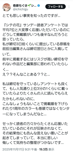1 : 2 : めちゃくちゃ可哀想やけど前の方に載ってたらもっと読まれてたとかあるか? 7 : >>2 それはある 一冊じっくり全部読むやつなんて少数派だし 28 : >>2 コナンやフリーレン目当てで間に挟まってたやつも目を通すかってのはあるやろ…