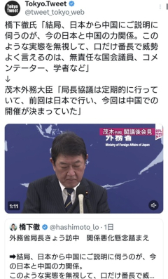 1: ベスティーちゃん(東京都) [CN] 2025/11/19(水) 09:50:38.32 ID:Unmq6ssa0● BE:662593167-2BP(2000) sssp://img.5ch.net/ico/taxi.gif 引用元: ・ スポンサーリンク スポンサーリンク 3: イッセンマン(埼玉県) [TW] 2025/11/19(水) 09:51:29.07 ID:jAKckZC20 >>1 なんか橋本ってC国に弱みでも握られたんかってぐらい最近おかしいよな 18: ポリタン(北海道) [US] 2025/11/19(水) 09:57:04.01 ID:RcuP73Ii0 >>3 元々おかしいよ 中居問題や大谷の通訳問題とか 117: トッポ(北海道) [CZ] 2025/11/19(水) 10:28:39.72 ID:k8iKMdPE0 >>18 まあ目立ちたがり屋だろうしな。 目立つには時流に乗るか、逆張りするか、どっちかしかないから振れ幅もでかくなる。 今は高市の支持率が高すぎるし橋下は政治から距離置いてるから目立つには逆張りするのが正解だとは思う。 好き嫌いは別として。 119: mi-na(茸) [ニダ] 2025/11/19(水) 10:29:16.21 ID:3vN9Xb490 >>3 それは自分も思った 130: なーのちゃん(庭) [US] 2025/11/19(水) 10:38:42.11 ID:8/lfgOIQ0 >>3 昔からだが 26: チップちゃん(茸) [US] 2025/11/19(水) 09:58:55.29 ID:NvxKaW3B0 >>1 >口だけ番長で威勢よく言えるのは、無責任な国会議員、コメンテーター、学者など ちゃんと自分が口だけ番長って自覚はあるんだな ただ、今回は国家議員側で無責任なのは岡田くらいだから味方まで巻き込んだ特大ブーメランにしかならなかったが 44: シンシン(庭) [US] 2025/11/19(水) 10:05:11.64 ID:pXpJzWwZ0 >>1 負け惜しみカッコ悪すぎる 73: ほっしー(福岡県) [US] 2025/11/19(水) 10:14:43.00 ID:N5eorui60 >>1 わざわざ行ったから負けってより 悪いこと言っちゃったな―という意識が政府にあったから行ったんだよ 88: 省エネ王子(みょ) [US] 2025/11/19(水) 10:19:05.28 ID:/0XiU7f50 >>73 日程はけっこう前から決まってたらしいがな あとこの中国の局長さんは 日本側の局長のお見送りのために 一緒に一階玄関まで来てるんだよ お見送りのために 162: マー坊(茸) [DE] 2025/11/19(水) 11:14:36.04 ID:CoHd7EFj0 >>1 国政を知らず、外交を知らない 自分も無責任なコメンテーターの1人ということを体現してくれてるな 261: DJサニー(ジパング) [EU] 2025/11/19(水) 13:19:56.20 ID:sBx+rc000 >>1 外務省が大使を呼び出して抗議をするというのはあるが 今回は中国が局長を呼び出した形になる 外務省の役人は外交を知らないから のこのこ出かけて行ってしまった もし会談の予定があってもキャンセルするのが常識 12: 雪ちゃん(庭) [KR] 2025/11/19(水) 09:55:03.36 ID:OlLXCScI0 中国に喧嘩売るにしても、観光で稼ぐために円安にしてる今やることじゃない 13: ホックン(ジパング) [DE] 2025/11/19(水) 09:55:19.55 ID:H1VEVaGC0 中国に行くようになってから変わって来たって聞いたけど何があったんだろうね~ 19: いきいき黄門様(SB-Android) [US] 2025/11/19(水) 09:57:08.33 ID:QyKXtwqg0 これ見て日本の負けじゃないと思う奴いるの? 24: アイミー(庭) [US] 2025/11/19(水) 09:58:43.43 ID:AJoQcS2a0 >>19 それで判断するやつって頭どうなってるの? 28: プイ(茸) [US] 2025/11/19(水) 09:59:08.12 ID:NaCuFsjY0 >>19 セッケンの発言といい中国の外交官はチンピラと変わらんのがよくわかった。外交官は普通の国ではエリートがなるもんだが、中国では違うようだ。 39: お前はVIPで死ねやゴミ(庭) [ZA] 2025/11/19(水) 10:03:37.02 ID:/ZB1bNmf0 >>19 金井局長は半分笑ってて役者の修行が足らない 劉局長はチンピラ感が出てて良く研究されてる 60: カッパ(神奈川県) [US] 2025/11/19(水) 10:09:52.07 ID:rgxjcGD00 >>19 連写してほんの一瞬頭を下げたように見えるところを使っただけだろ 62: ブラット君(ジパング) [BR] 2025/11/19(水) 10:10:28.02 ID:RDu7lKw40 >>19 キャンセル料すら払えない貧乏人中国の負け 中国からの“渡航自粛”の影響が…ツアー1000人分の直前キャンセル「キャンセル料は免除してくれ」 [567637504] 146: パー子ちゃん(庭) [RU] 2025/11/19(水) 10:50:34.97 ID:ZM+Fl5yC0 >>19 半分わろてるやん 193: わくわく太郎(みかか) [US] 2025/11/19(水) 11:50:38.54 ID:eLfj8fMn0 >>19 単なる切り取りだよ 262: でんこちゃん(庭) [ニダ] 2025/11/19(水) 13:20:57.16 ID:ZATaYYA60 >>19 なお 日本「その態度はなんだ?お?」 中国「目を合わせられないアル〓」 29: リスモ(大阪府) [DE] 2025/11/19(水) 09:59:20.54 ID:7WGw6tjI0 橋下はなんでも自分の意見が正しいという主張が強すぎて一人でべらべら喋りすぎ 40: モバにゃぁ?(ジパング) [US] 2025/11/19(水) 10:03:49.88 ID:ZYLiqDHv0 なんでこんなにズレた人になっちゃったの 79: こんせんくん(みかか) [ニダ] 2025/11/19(水) 10:15:52.60 ID:HaAyFC400 >>40 メディア側の人間になったらしい 43: ナミー(みかか) [US] 2025/11/19(水) 10:04:49.84 ID:JDrHdc+k0 徹は高市憎しで逆張りしてるだけの哀れな男に成り下がったな 55: ラジオぼーや(ジパング) [AR] 2025/11/19(水) 10:08:46.17 ID:BG9g5iiy0 はしした「3時問題は立憲と共産がー」 そんなルールなかった コイツ恥かいてばっかだな? 65: ドギー(茸) [TW] 2025/11/19(水) 10:10:57.09 ID:SB0TJgW80 マスコミ全体が今回の問題に絡めての報道だからマスコミ全体でミスリードしたって事だわ 66: ぶんた(庭) [ニダ] 2025/11/19(水) 10:11:53.33 ID:L4uLgsmm0 >>65 出演させてるわけだからそういうふうに見られても仕方ないよね 68: ちかまる(光) [CN] 2025/11/19(水) 10:12:23.51 ID:pUM6Zu3y
