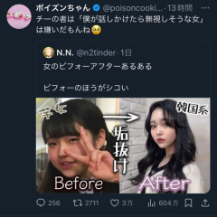 1: 2024/01/05(金) 08:30:02.87 ID:jx2UV4mx0 垢向けた女に対して「前の方が良かった」という特性 ※関連記事 【超画像】港区女子「なんでチー牛って左上みたいな女子が好きなの?」…