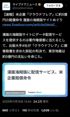 1 : 以下、?ちゃんねるからVIPがお送りします :2025/11/19(水) 21:06:35.386 ID:LrNVeyNm0.net海賊版サイトめぐり米・クラウドフレアに総額約5億円賠償命令 東京地裁 「ONE PIECE」や「進撃の巨人」も被害 - ライブドアニュース転載元スレッド:…